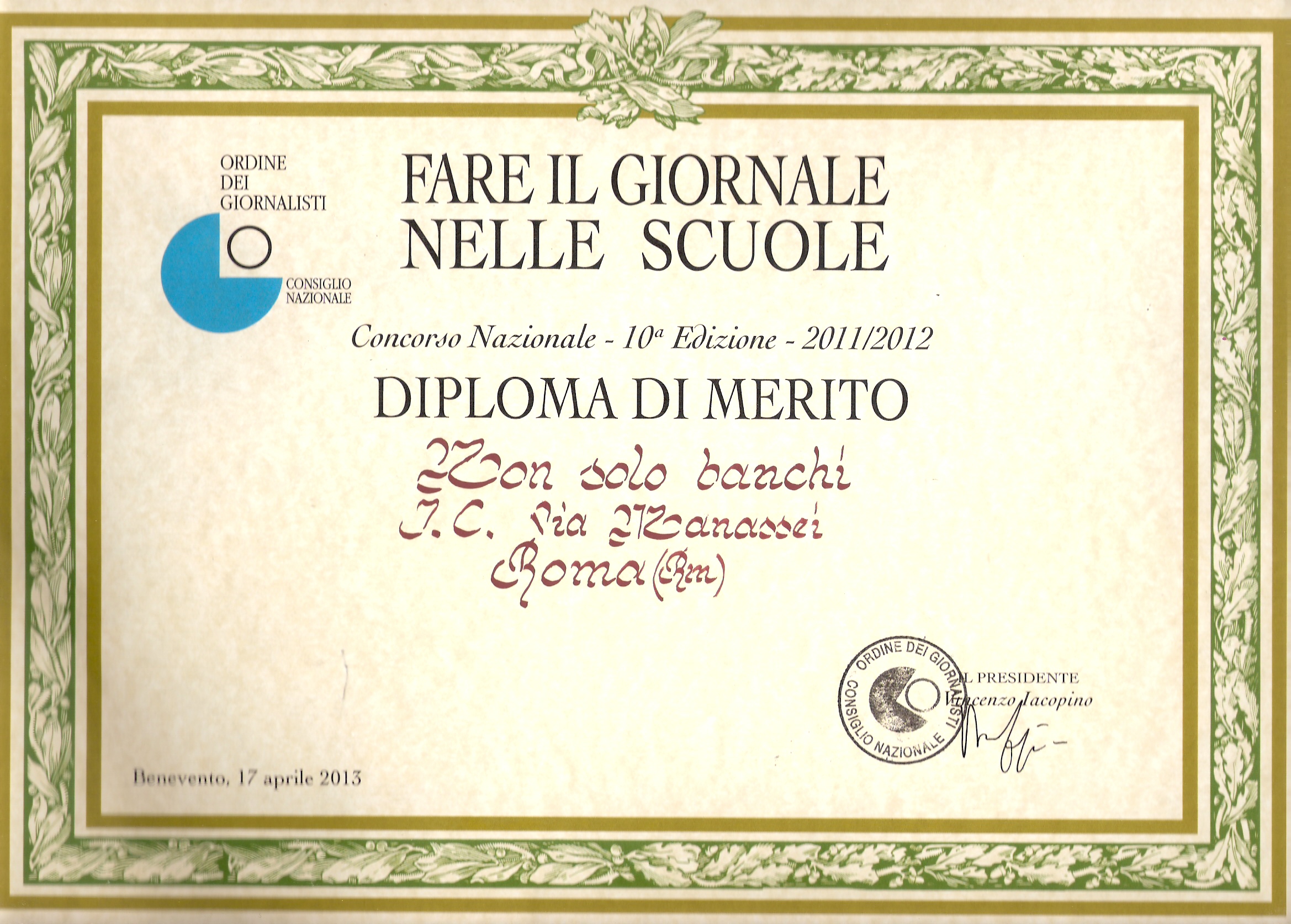 17 aprile 2013 Benevento – Premiazione del Giornalino On-line della scuola al Concorso nazionale.
