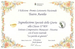La classe 2B della scuola media è stata premiata al “Concorso Letterario Nazionale” del Teatro Aurelio di Roma, con una “Segnalazione Speciale della Giuria” per l’opera teatrale “La parola ai giurati”.